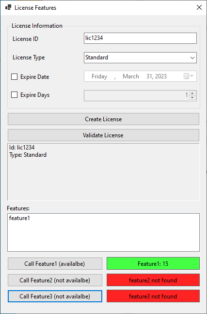 The LicenseManager class will check for a valid license and the presence of the requested features. If the license is valid and the features are enabled, the application will allow the user to access those features.