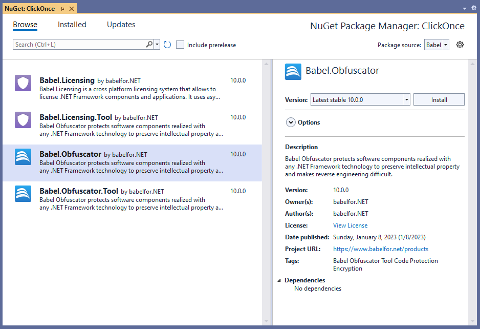 With the purchase of a Company license, you received several NuGet packages containing the Babel Obfuscator and Babel Licensing CLI tools for dotnet: