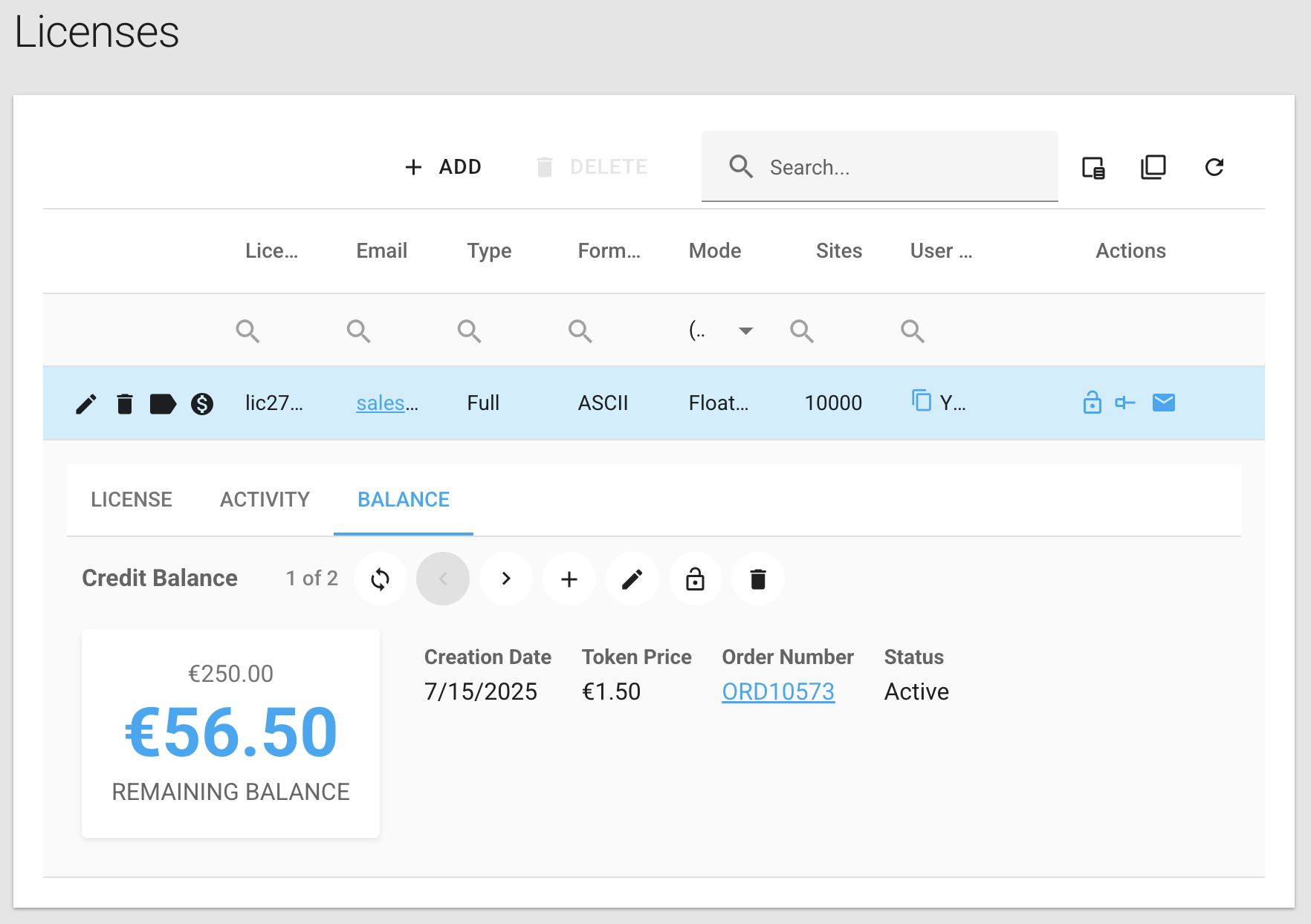 To create a new balance record for a license, click the $ icon located in the license row on the main licenses page. This navigates to the dedicated balances management page where you can: