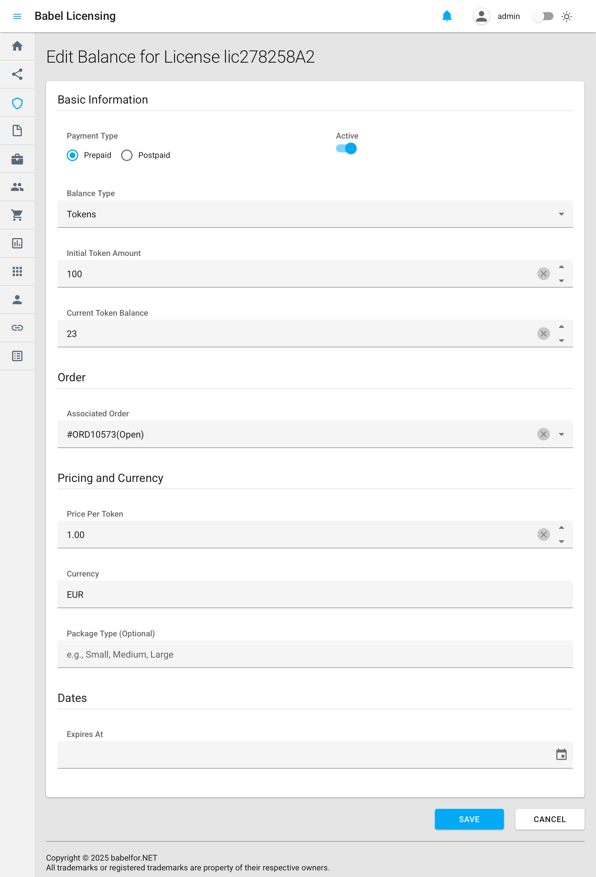The Babel Licensing web application provides comprehensive management capabilities for consumption tokens through an intuitive interface designed for both administrators and license managers.