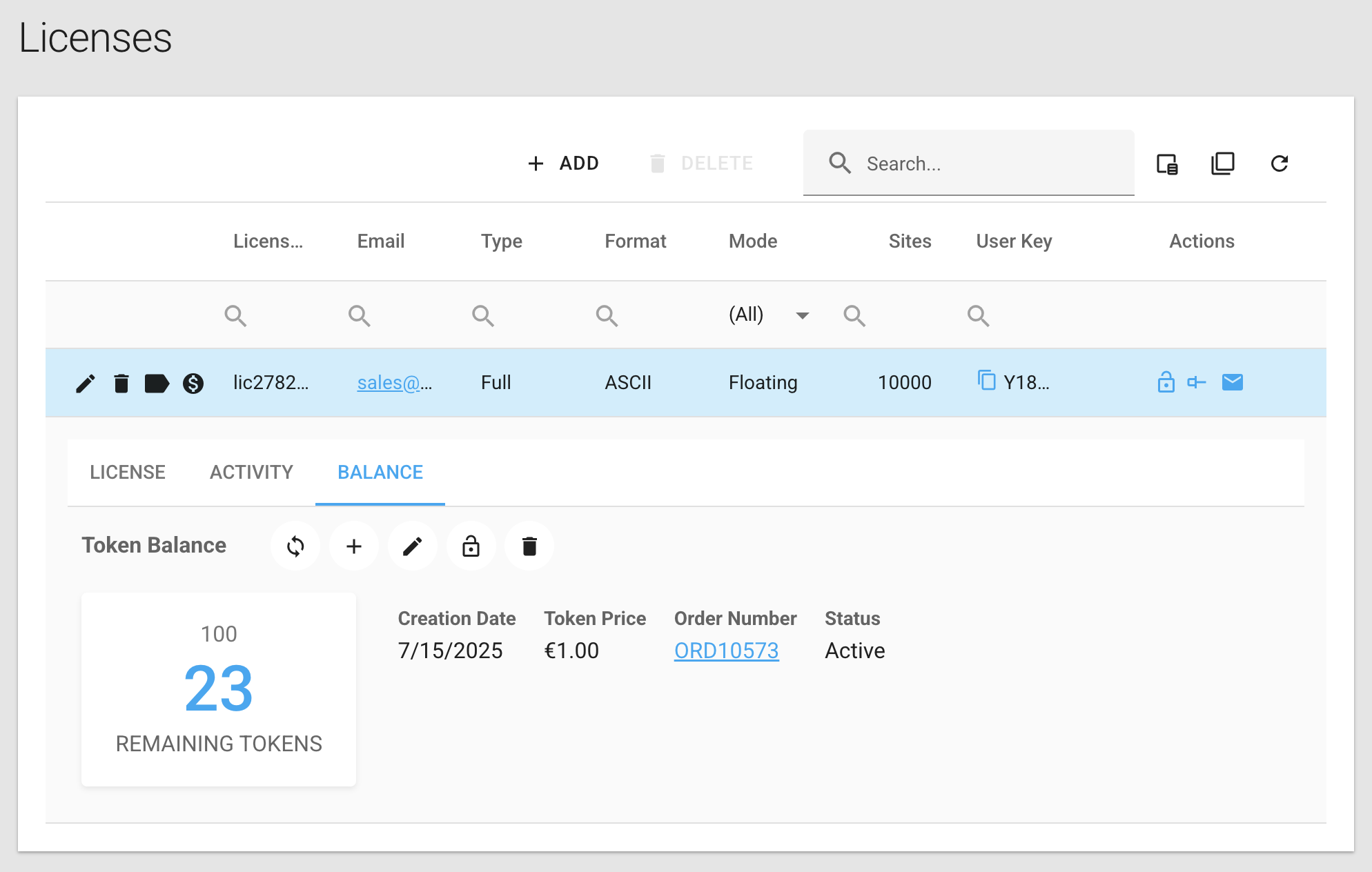The web application integrates consumption token management directly into the license details view through a dedicated Balance tab. This tab displays comprehensive information about the currently active balance associated with the selected license, including: