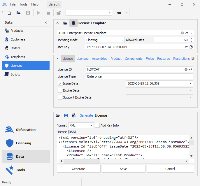 - Enter the necessary details for the license, such as the licensee information, license fields, allowed features, and expiration date.