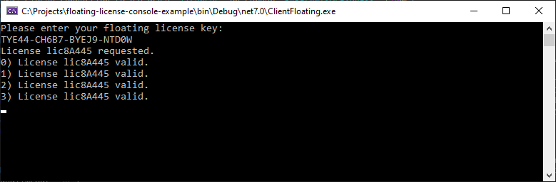 The user is prompted to enter the floating license key. The license key is used by the client to request a floating license by calling the RequestFloatingLicenseAsync method. The user key and the type of the program are passed as parameters. If successful, the method returns a result object containing the requested license information.