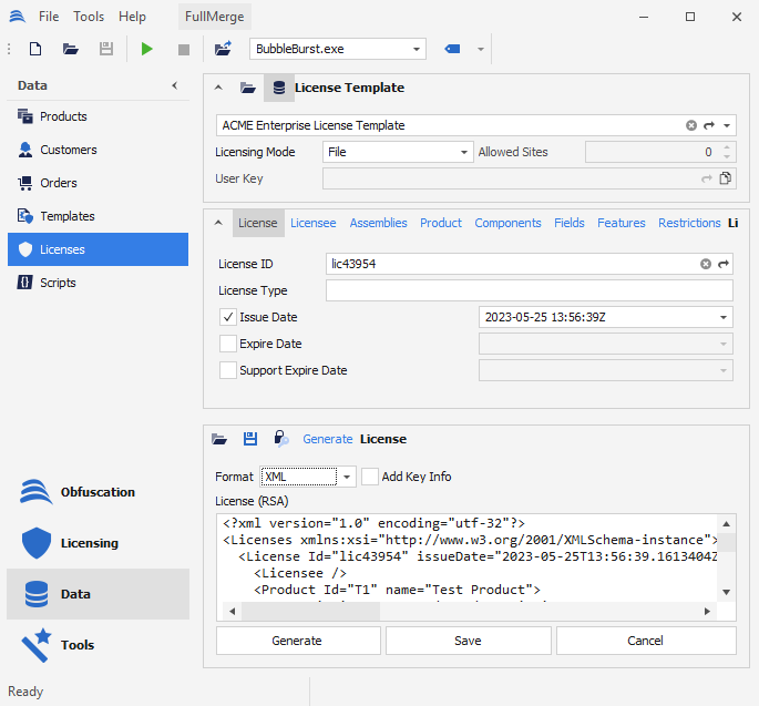 - Press the Generate button to generate the license, and then save by clicking the “Save” button.