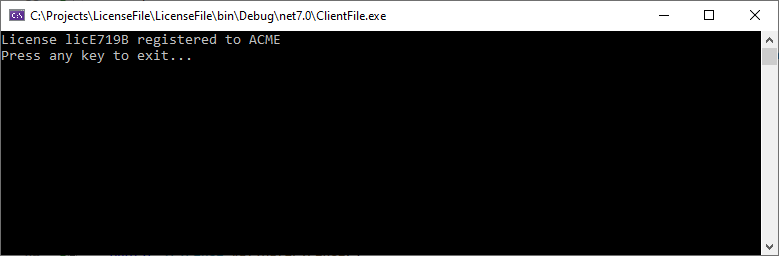 - The license file console sample application will launch, validating the license file and showing the licensee information.