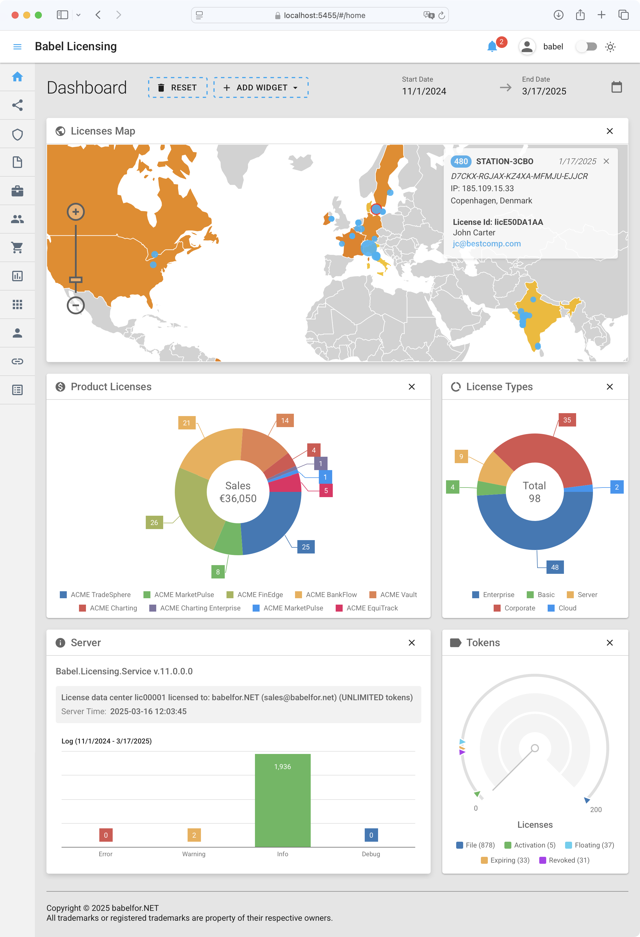 The Dashboard provides at-a-glance insights through customizable widgets. Monitor global license distribution on an interactive map, view sales metrics by product with pie charts, analyze license type distribution, check server status, and manage license tokens. The date range selector allows for precise time period analysis, helping you identify trends and make data-driven decisions. Read more