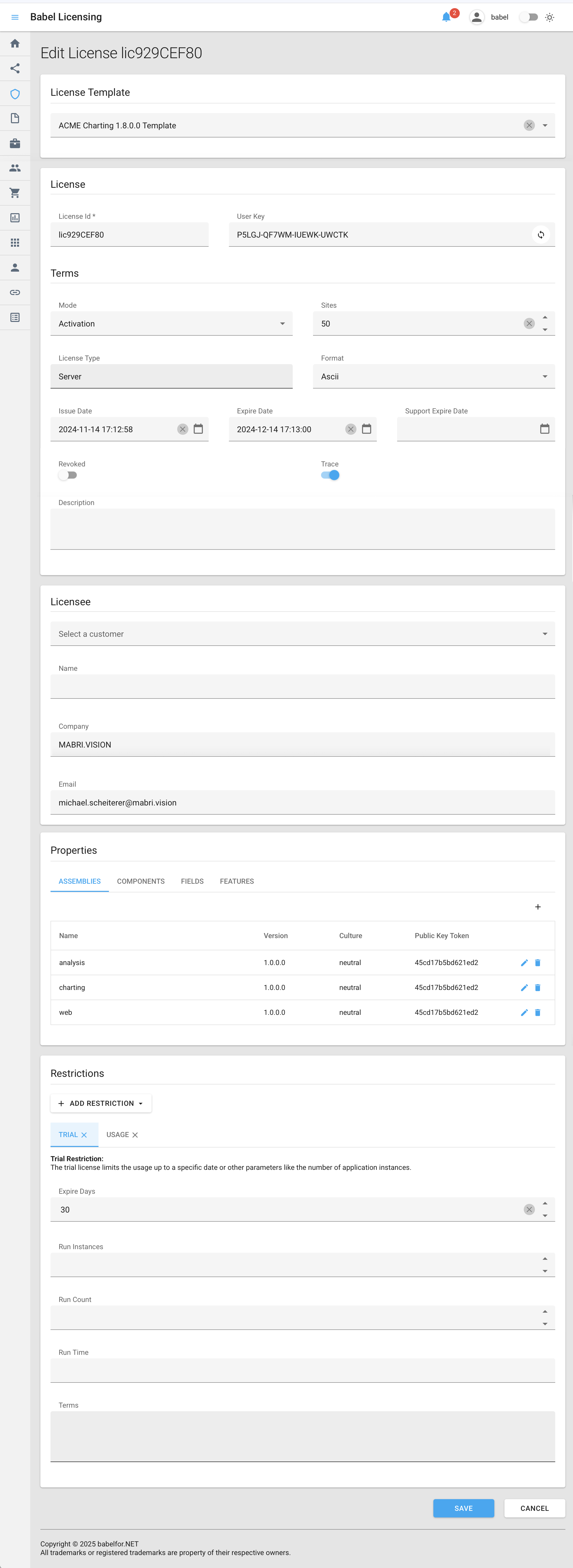 - Licensee: The name of the organization or individual who holds the license (e.g., MABRI.VISION)