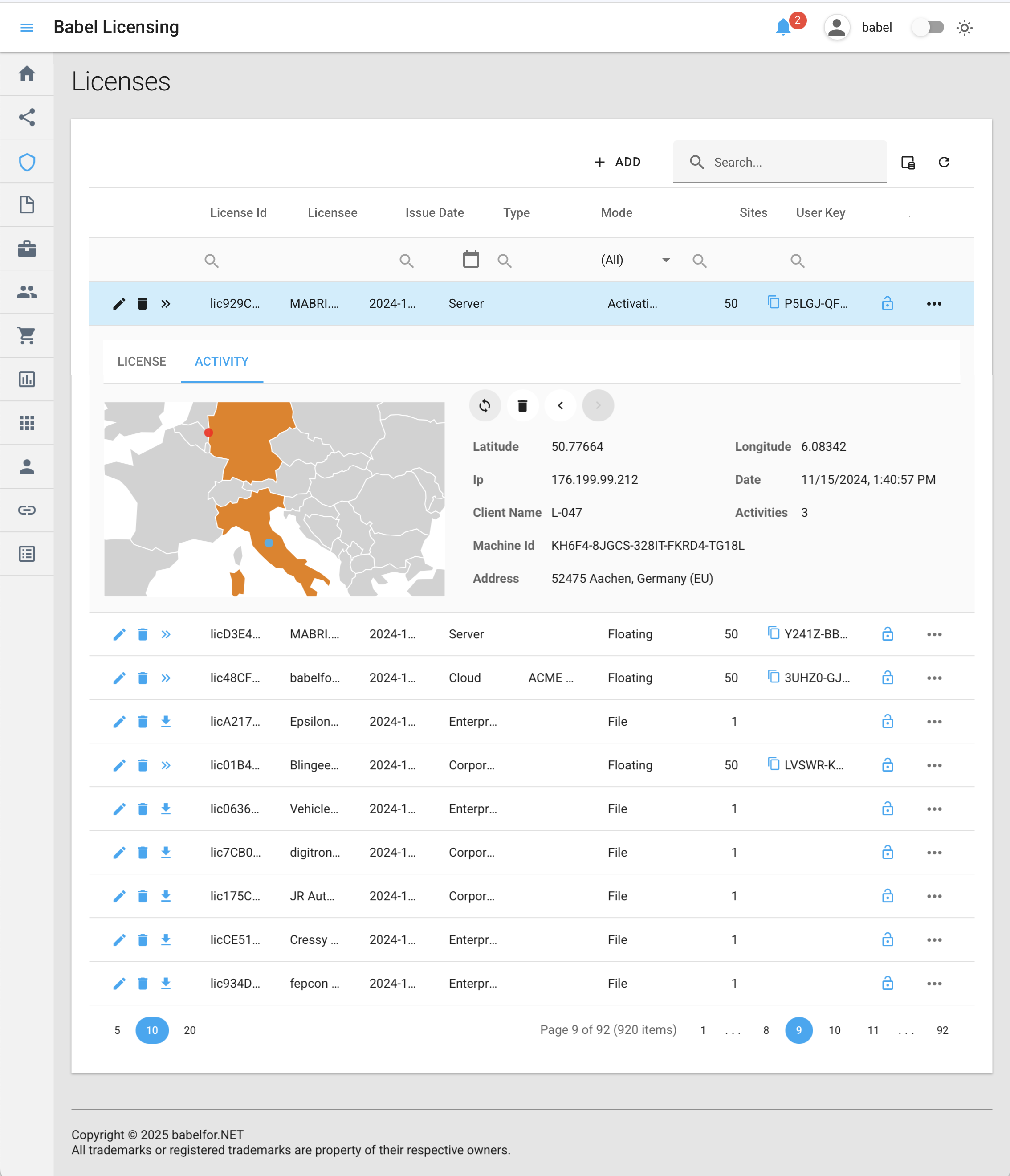 The Licenses page in the Babel Licensing Web Application provides a comprehensive interface to manage and monitor all software licenses in your system. This page displays licensing information in a tabular format, with each row representing a unique license entry. The interface allows you to view license details, track license activities, and perform various license management operations.
