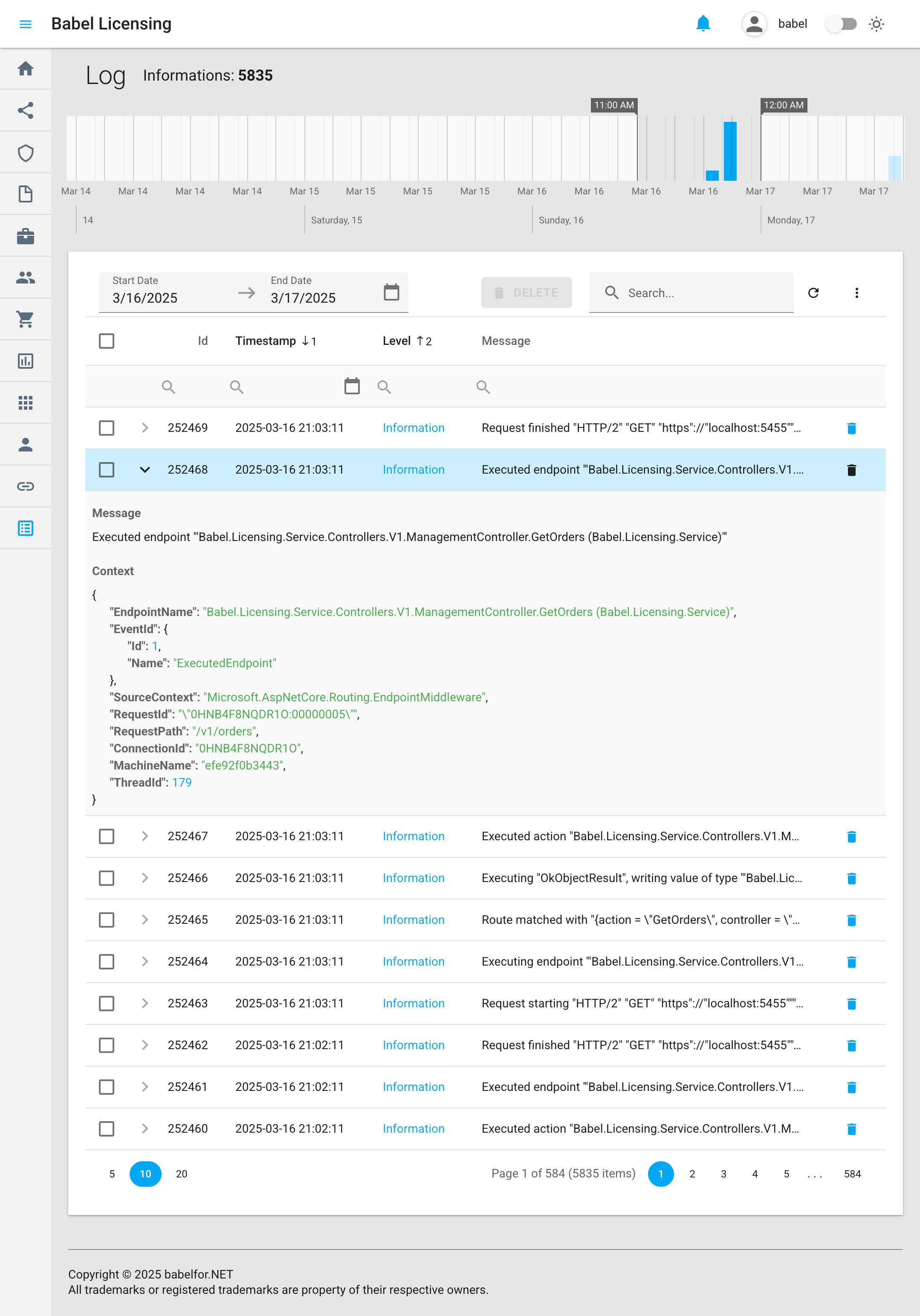The Log section of the Babel Licensing Web Application provides a comprehensive monitoring and troubleshooting tool that records all system activities and events. This page displays detailed information about application requests, actions, and processes, enabling administrators to track system behavior and diagnose issues.