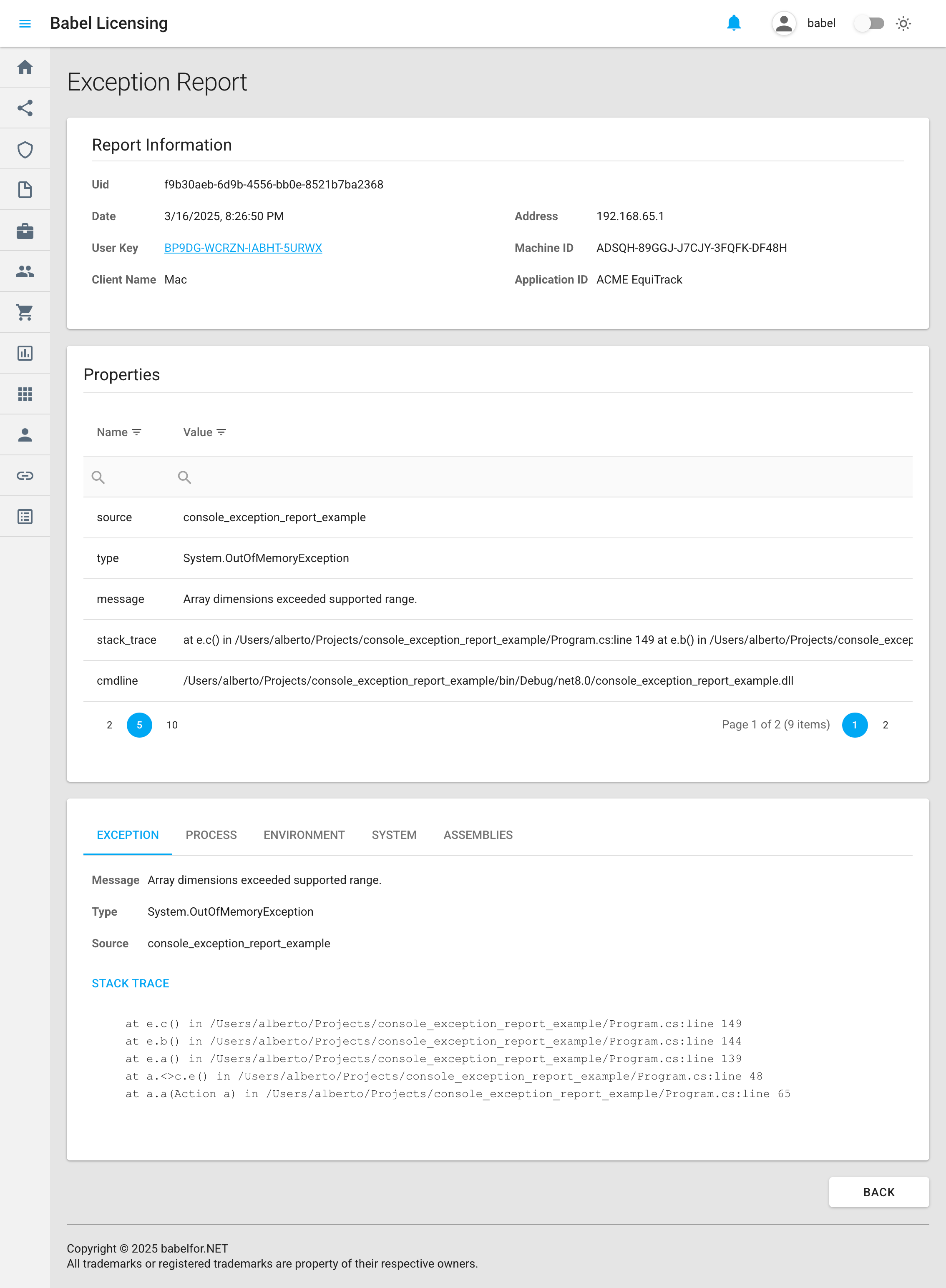 - Source: The source of the exception (e.g., “console_exception_report_example”)