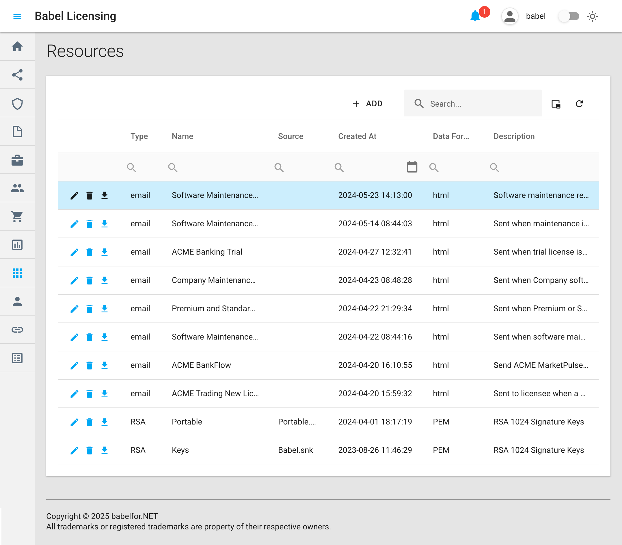 The Resources page in the Babel Licensing Web Application provides a central repository for managing various digital assets used throughout the licensing service. This page allows you to organize, access, and maintain important files such as email templates, signature keys, and other resources that support your licensing operations.