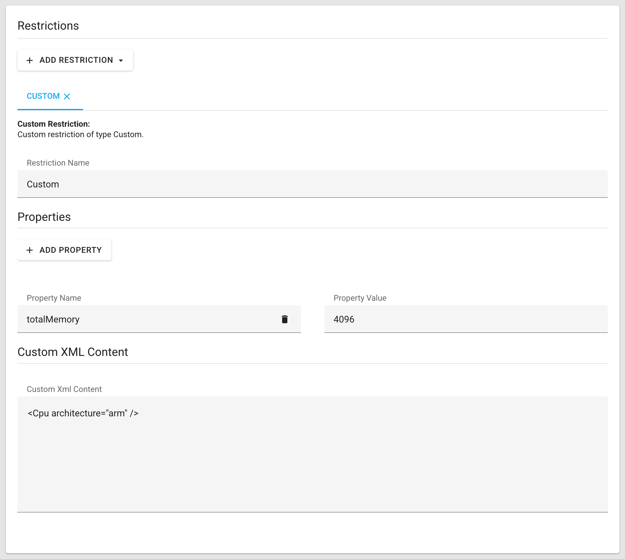 - Custom XML Content: Advanced configuration using XML syntax to define complex restriction logic that is represented by XML elements children of the custom Restriction element.