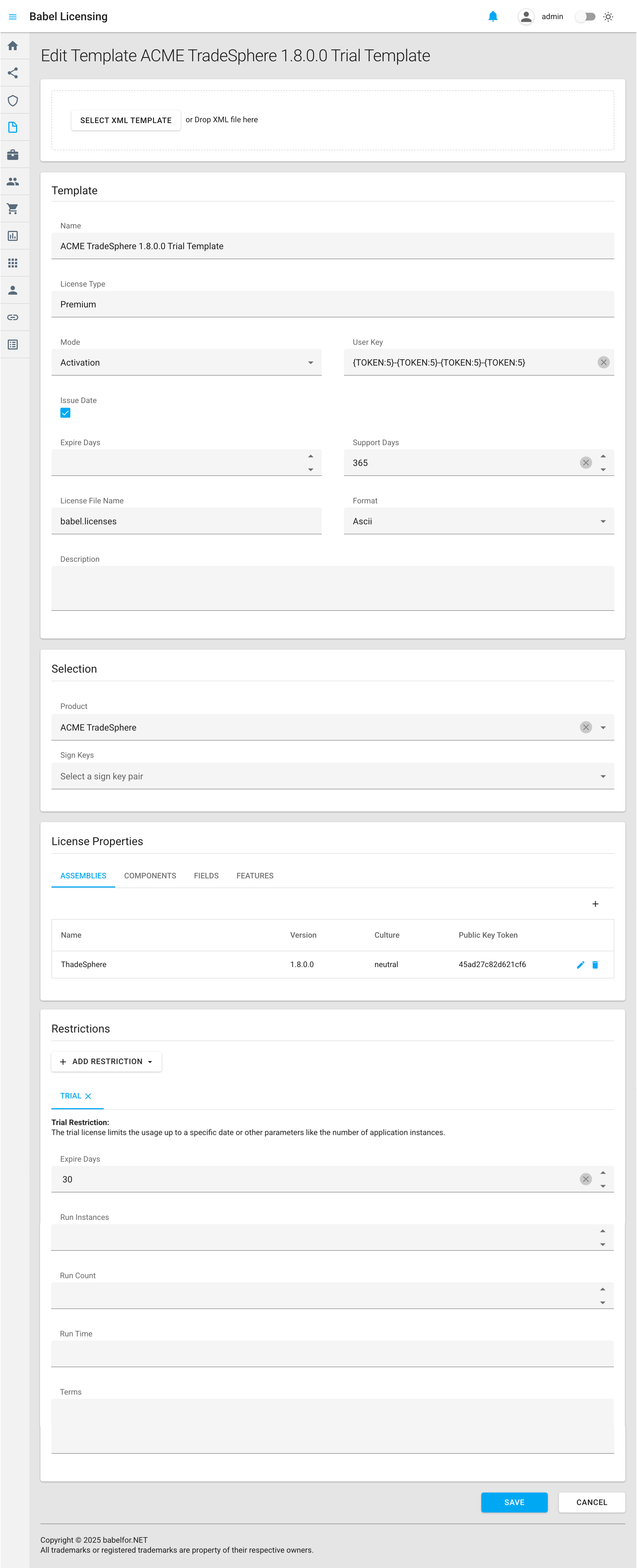 The Edit Template screen in Babel Licensing allows you to create or modify license templates. This comprehensive interface is divided into several sections, each controlling different aspects of the license template.