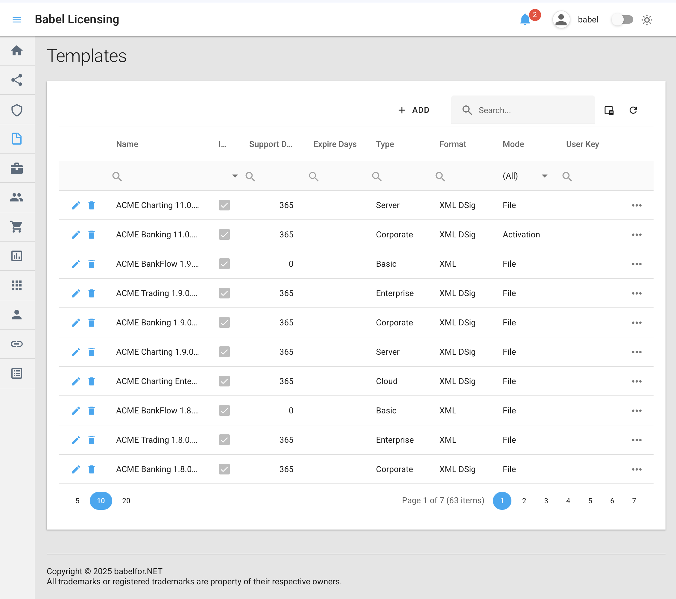 The License Templates view in Babel Licensing provides a comprehensive interface for managing license templates that serve as the foundation for creating and issuing licenses to your customers. These templates define the standard parameters and configurations that will be applied to new licenses.