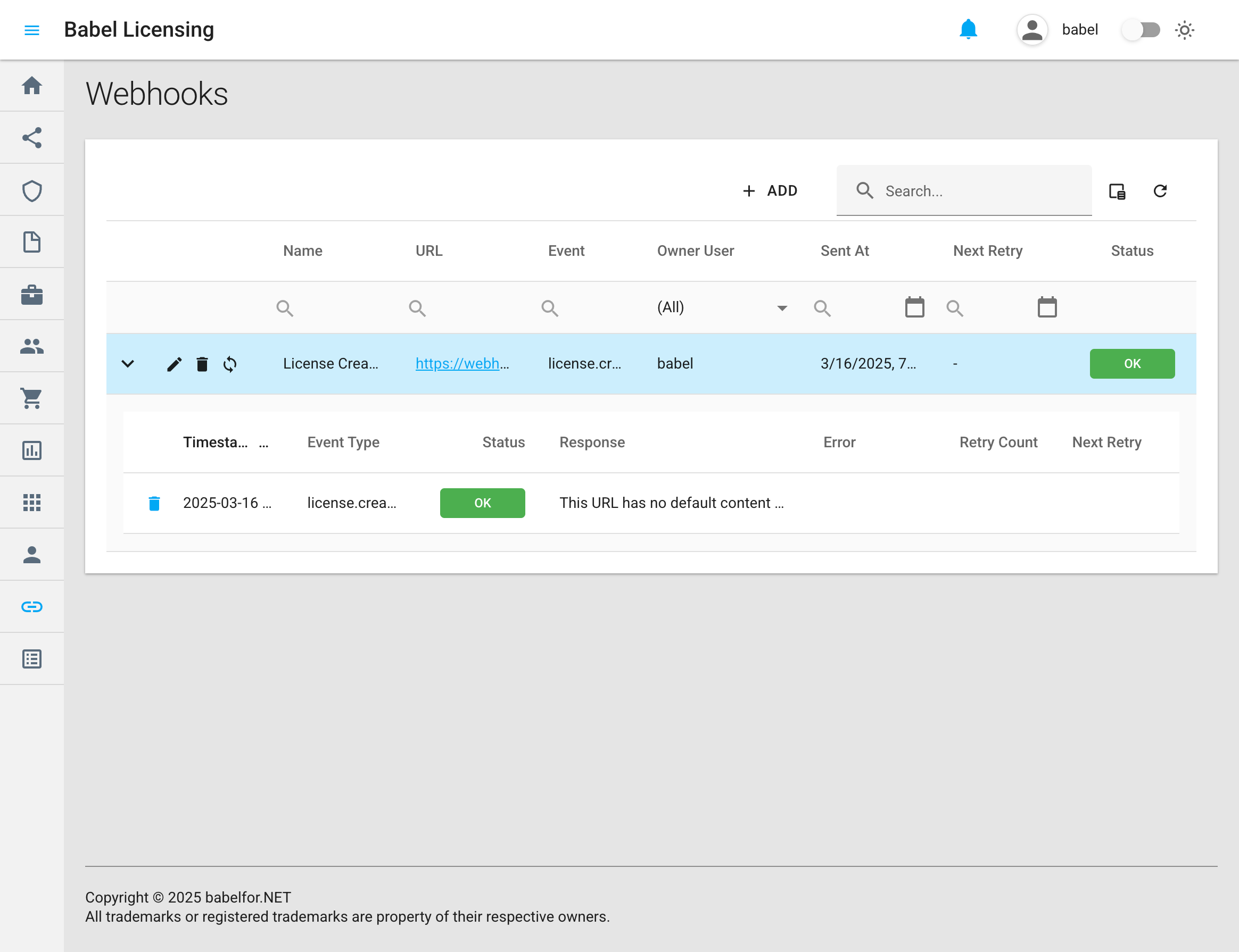 Webhooks allow external applications to receive real-time notifications when specific events occur in the Babel Licensing Service. This feature enables seamless integration with your existing systems, allowing you to automate workflows and keep your data synchronized.