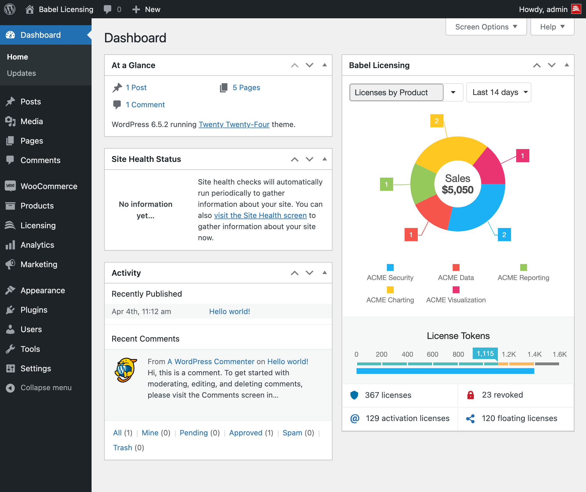 This plugin delivers a streamlined and intuitive interface within the WordPress admin panel, specifically designed for the management of Products, License Templates, Customers and Licenses associated with the Babel Licensing Database.