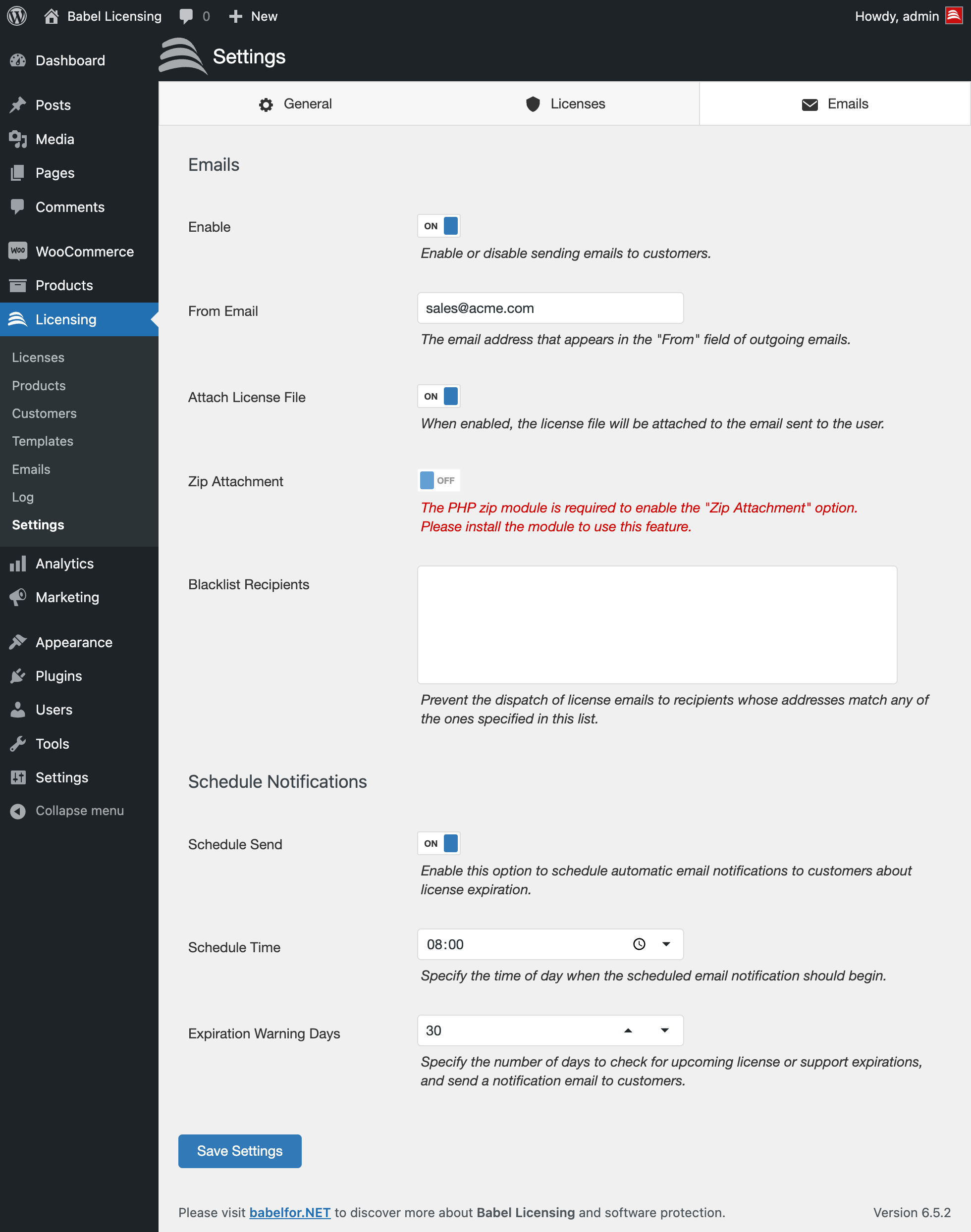 Babel Licensing can automatically send emails at different stages of the license lifecycle to inform both the administrator and the customer. To enable and configure email notifications: