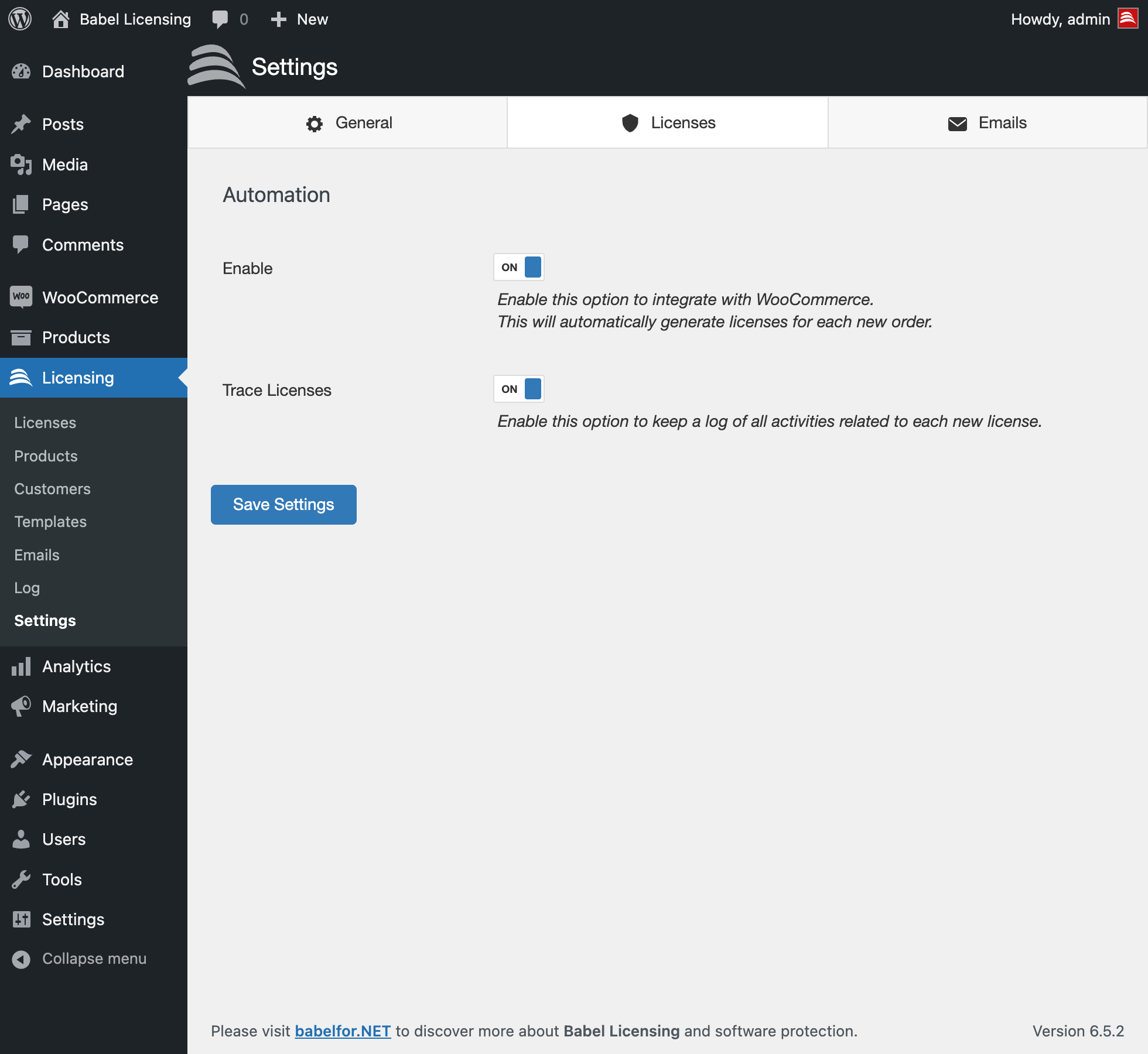 With these settings configured, Babel Licensing will automatically generate a new license each time a designated product order is successfully completed in WooCommerce.