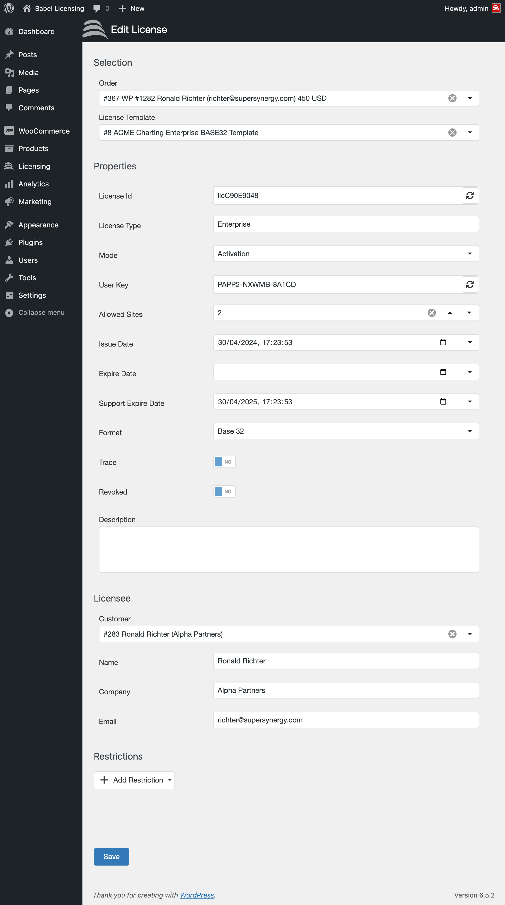 The āEdit Licenseā page of the Babel Licensing WordPress Plugin provides a detailed interface for modifying the parameters of an existing license. This functionality is crucial for administrators who need to update license details as circumstances change, such as extending a licenseās validity, altering the licensee information, or adding restrictions.