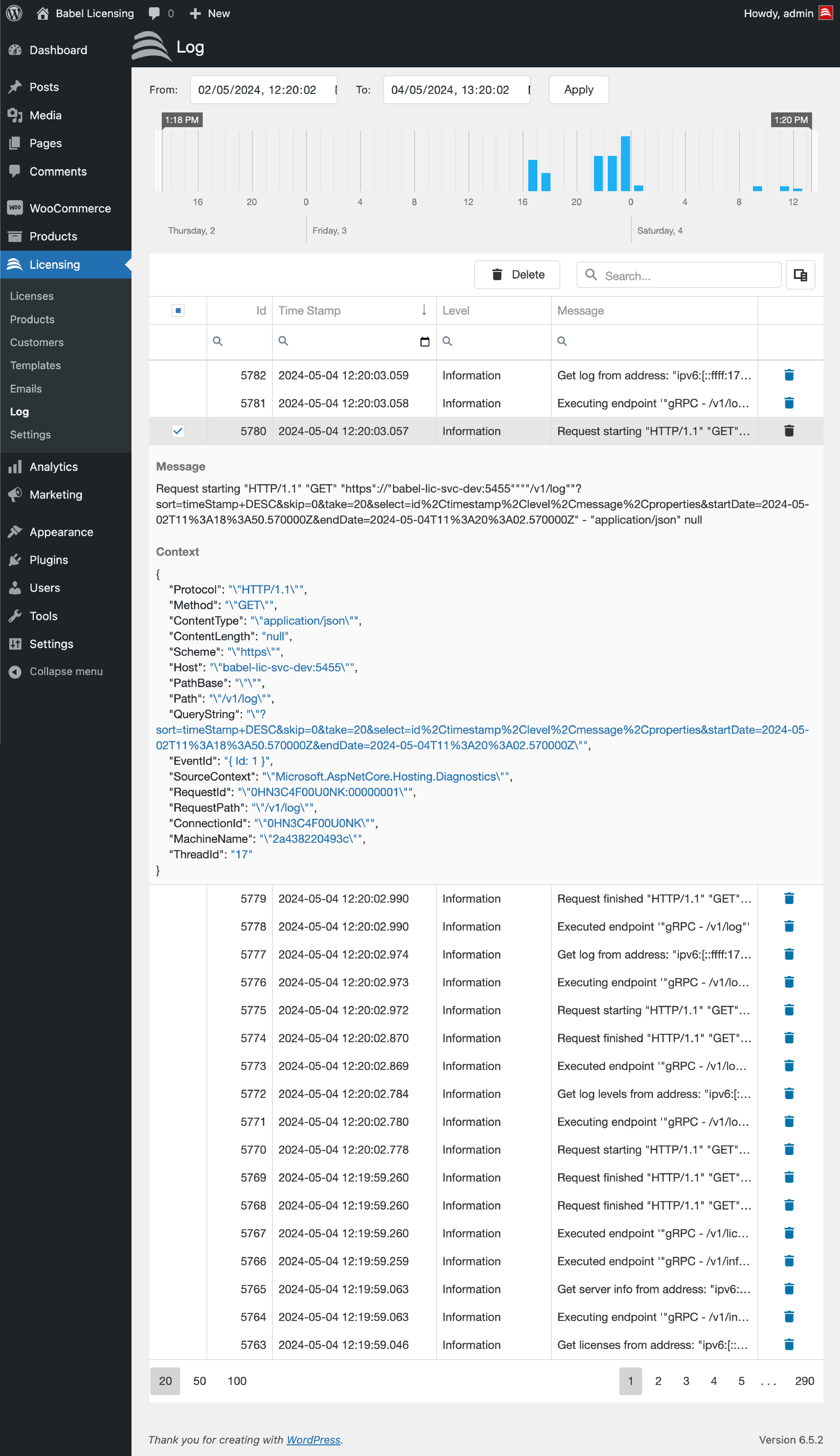 The Log page within the Babel Licensing WordPress Plugin serves as a crucial tool for monitoring and diagnosing interactions with the Babel Licensing Service. This page provides a detailed log of all incoming web requests, system actions, and internal operations, enabling administrators to effectively track and analyze the behavior and performance of the licensing system.
