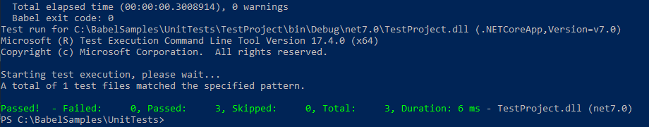 - Enter the command “dotnet test” to run the sample project.