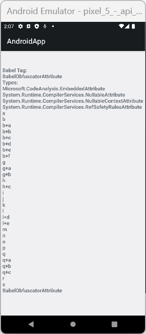 This example project demonstrates integrating the Babel Obfuscator NuGet package into an Android application and customising its obfuscation settings to achieve specific results. Through this example, users can gain insights into how Babel Obfuscator can help protect their Android applications by renaming types and methods, removing metadata, encrypting strings and adding control flow obfuscation to their code, enhancing the overall application security.