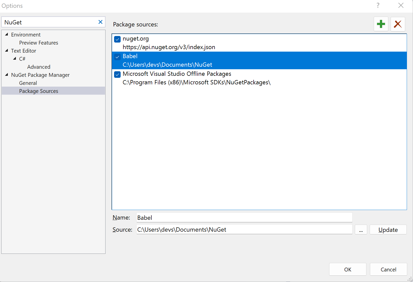 Press the button with the plus icon and enter the Name field Babel and the Source field the full path to the folder containing the Babel Obfuscator NuGet package files. Press the OK button.