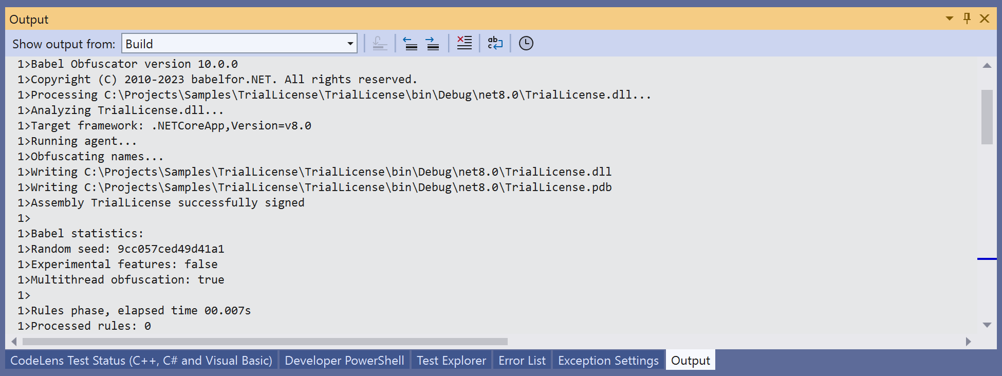 When building the project with the Babel Obfuscator NuGet package, the target assembly will be obfuscated, and the obfuscation log will be displayed in the Visual Studio Output window.