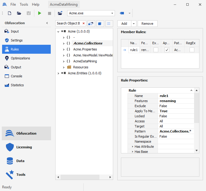 | targetAssembly | Specifies the fully qualified name of the assembly to which the rules are applied. If not defined, the rules will apply to all assemblies involved in the obfuscation process. |