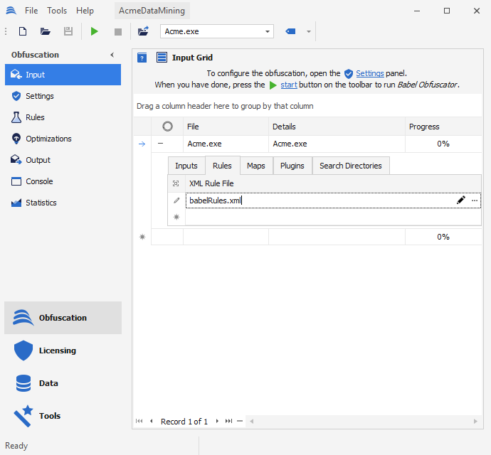 In Babel Obfuscator UI, all rules defined in the “Rules” panel for a given target assembly are automatically stored within the project file using the XmlRules attribute of the Babel task. By storing the rules directly in the project file, Babel Obfuscator UI ensures that all obfuscation rules are maintained together with the project configuration and remain easily accessible. This integrated approach makes it convenient to manage and update rules as needed, while ensuring that the rules are always version-controlled and saved alongside the project.