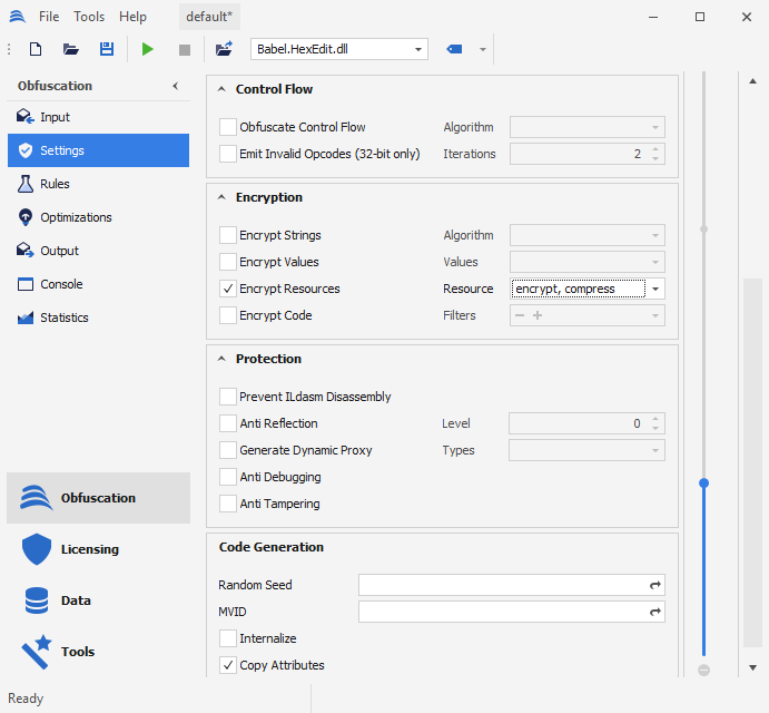 Babel Obfuscator offers the capability to compress and encrypt embedded resources, providing both resource protection and reducing the overall size of the assembly. When resources are encrypted, they remain securely stored within the assembly and are loaded dynamically at runtime when required.