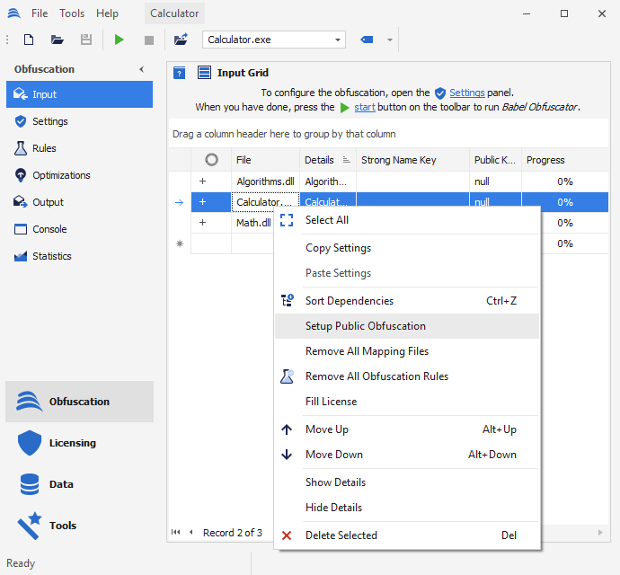 To utilize this feature, drag and drop all the assemblies you wish to cross-obfuscate into the Input Grid. Then, right-click in the Input Grid and select “Setup Public Obfuscation” from the drop-down menu. This will enable the Babel Obfuscator to automatically generate an appropriate obfuscation order for the selected assemblies and set up the correct XML mapping files for every assembly in the obfuscation project including XML rules for enabling obfuscation of the public interface with minimal effort on your part.