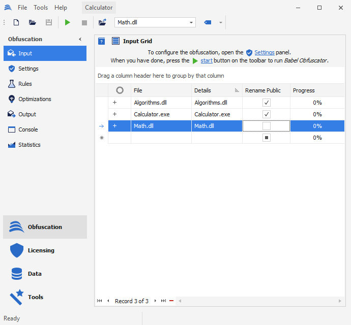 Drag and drop the “Rename Public” field into the Input Grid. Now you can uncheck the “Rename Public” checkbox for each assembly that should not have the public interface mangled. By unchecking this field, Babel will remove the obfuscation rule created to rename all public symbols exposed by the third-party assembly, effectively excluding it from the public obfuscation process.