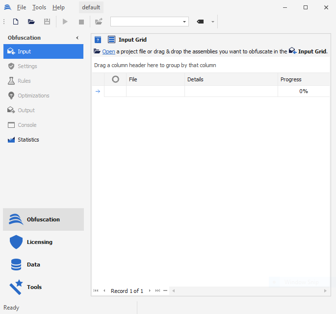 Once the Babel User Interface is launched, a main window will be displayed that features a navigation panel on the left and a main section showcasing the view for the currently selected option. The navigation panel is divided into two sections, with functional groups, such as Obfuscation, Licensing, Data, and Tools, located at the bottom and options related to the selected functional group item positioned at the top.